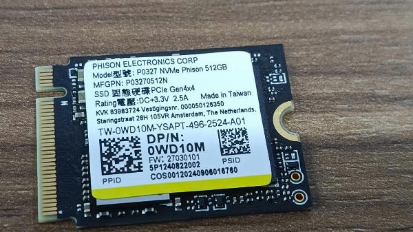 Ổ cứng thể rắn NVMe 512 GB do Phison Electronics sản xuất, định dạng module M.2 (kiểu module ngắn — khả năng là 2230), giao tiếp PCIe Gen4×4, thiết kế một mặt, phù hợp cho laptop nhỏ gọn, máy tính bảng / hệ thống nhúng và nâng cấp lưu trữ cho các thiết bị có khe M.2 NVMe ngắn. Sản phẩm in nhãn có mã model P0327 NVMe Phison 512GB (MFGPN: P03270512N), sản xuất tại Đài Loan.